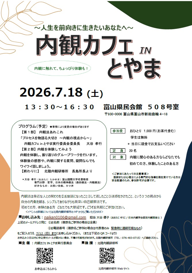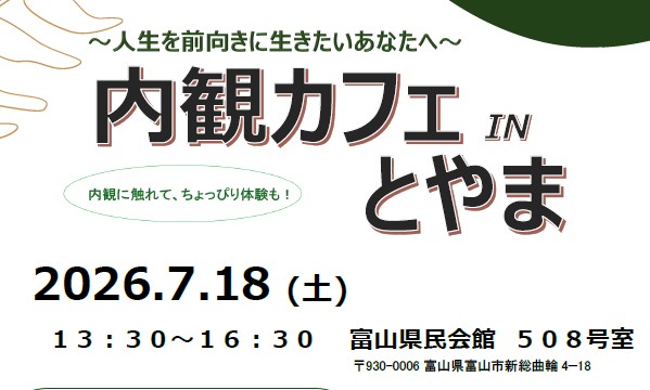 この「内観カフェ名古屋」のコンセプトをベースにさせていただき、富山の地でも内観法を広く知っていただくための試みとして「内観カフェINとやま」を開催する運びとなりました。